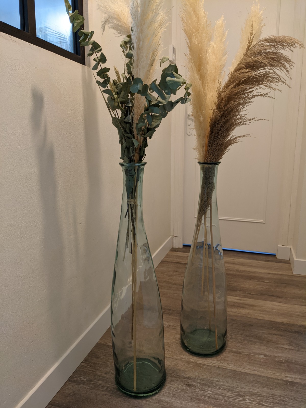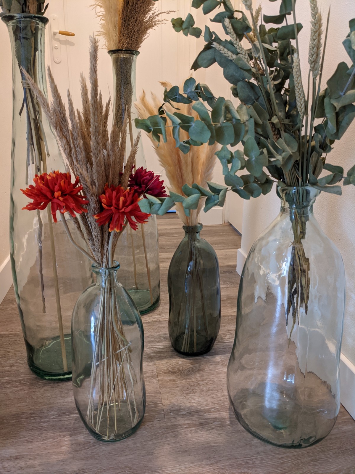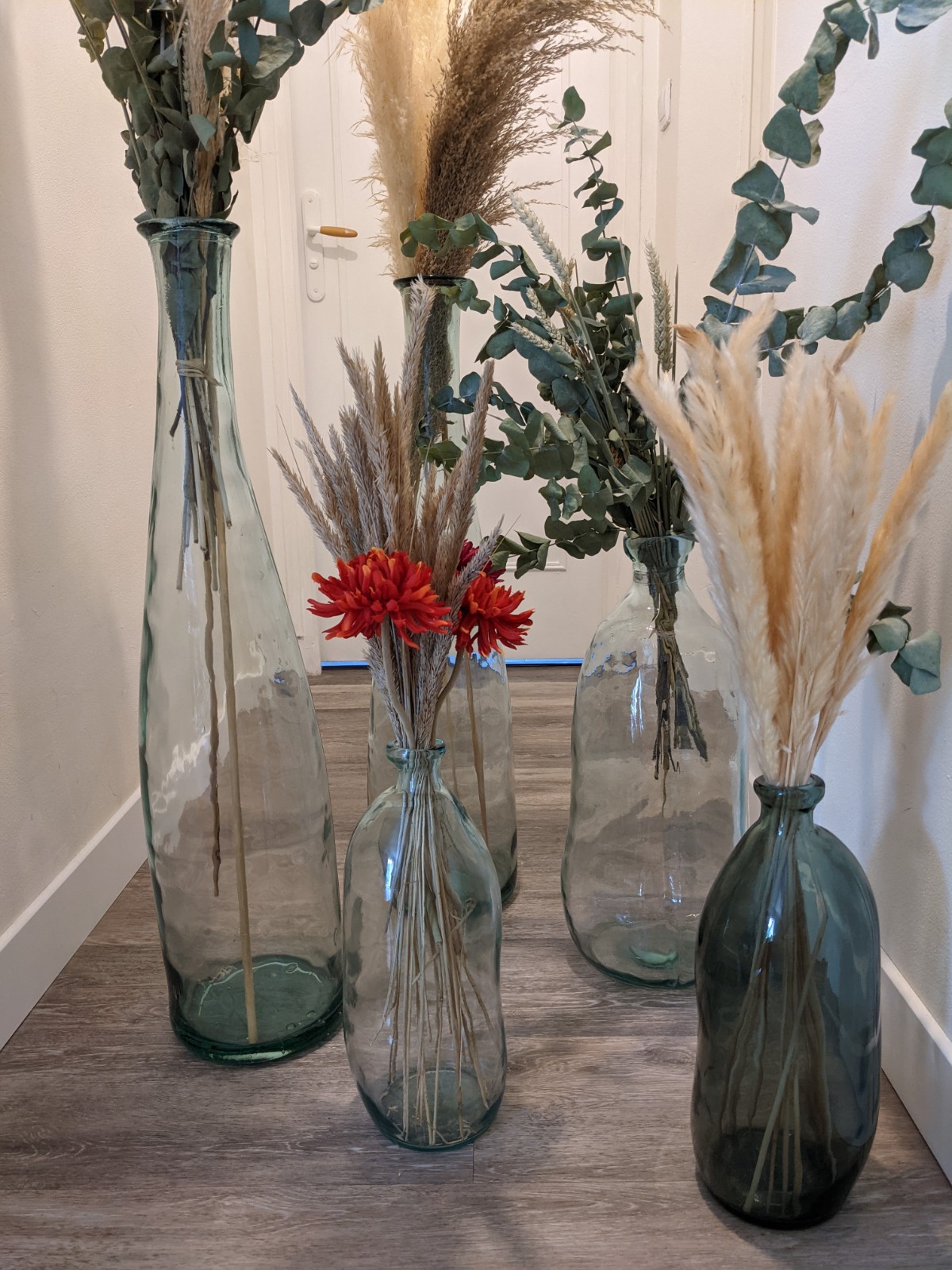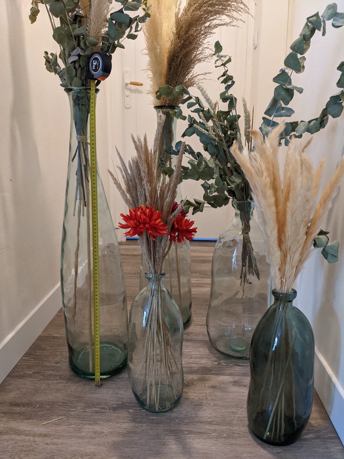 Pour les dames-jeanne, voici toutes celles dont nous disposons : Hauteur max des deux plus grandes 80cm, les trois autres sont de bons volumes également.